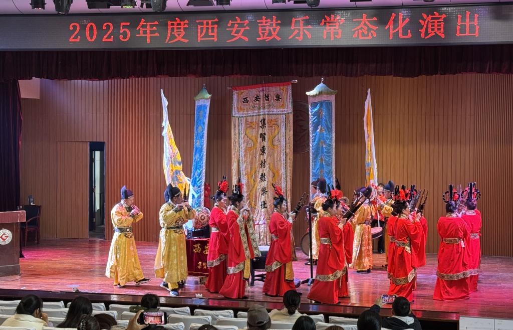 11月5日上午,国家级非物质文化遗产西安鼓乐的分支集贤东村鼓乐,在非物质文化遗产鼓乐传承人顾景昭先生带领下在高新校区音乐厅为我校师生带来一场沉浸式传统文化盛宴。