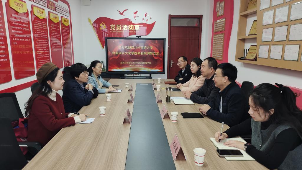 11月14日上午,四川外国语大学中国语言文化学院党总支书记薛红等3人来我校文学与新闻传播学院交流座谈。座谈会在高新校区博文楼702室举行,文学与新闻传播学院党委书记张红亮主持座谈会。
