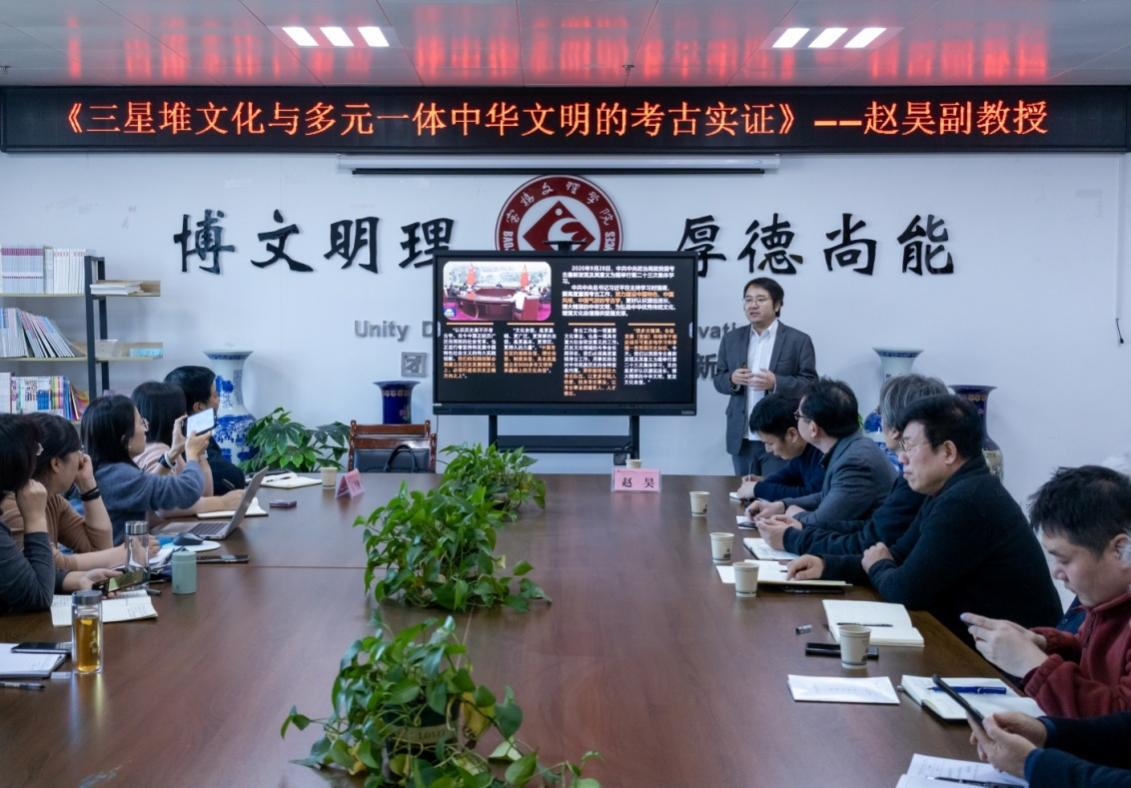 11月18日,北京大学考古文博学院赵昊副教授以《三星堆文化与多元一体中华文明的考古实证》为题,在高新校区博文楼1301会议室作学术报告。报告会由科研管理处、美术与设计学院及宝鸡市古文字书法艺术研究所联合主办。副校长冯飞龙教授参加报告会,美术与设计学院院长李强教授主持会议。