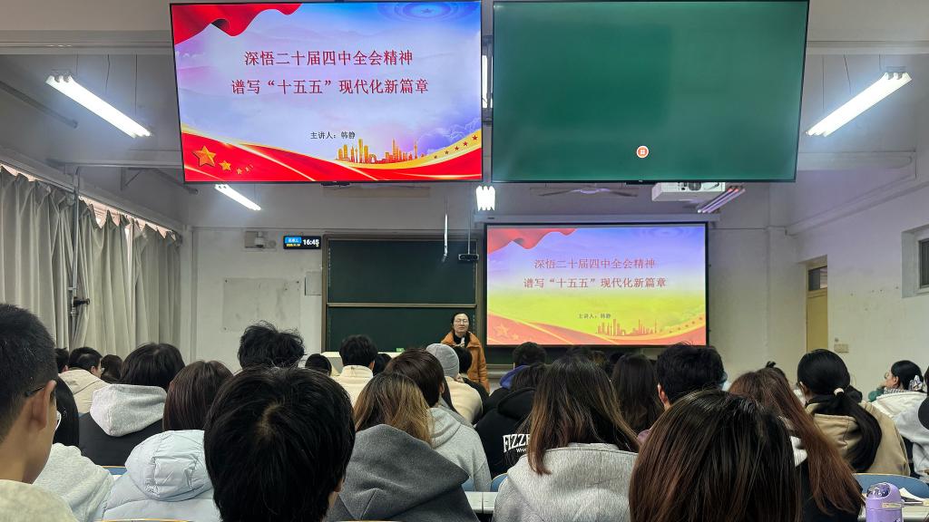 马克思主义学院韩静副教授以《深悟党的二十届四中全会精神谱写“十五五”现代化新篇章》为题作了主题辅导。她深入阐释了党的二十届四中全会召开的深远历史意义与重大现实意义,用系统的理论阐释、鲜活的现实案例,重点介绍了党的二十届四中全会精神和“十五五”《建议》,简要回顾了“十四五”时期我国经济社会发展的辉煌成就,详细解读了“十五五”规划的主要内容及其亮点特色,结合经济管理类专业特色,通过行业案例分析、热点问题研讨、互动答疑等形式,将宏观政策与专业学习、职业发展紧密结合,帮助师生深刻理解全会精神在经济社会发展中的指导意义,明确新时代青年的责任与使命。
