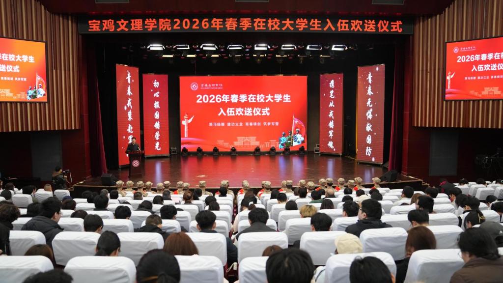 3月13日上午,学校在高新校区博文楼报告厅举行2026年春季在校大学生入伍欢送仪式。校党委副书记韩干校出席仪式并讲话,渭滨区人民武装部政委宋景富、高新公安分局马营派出所政治教导员杨林受邀参加。
