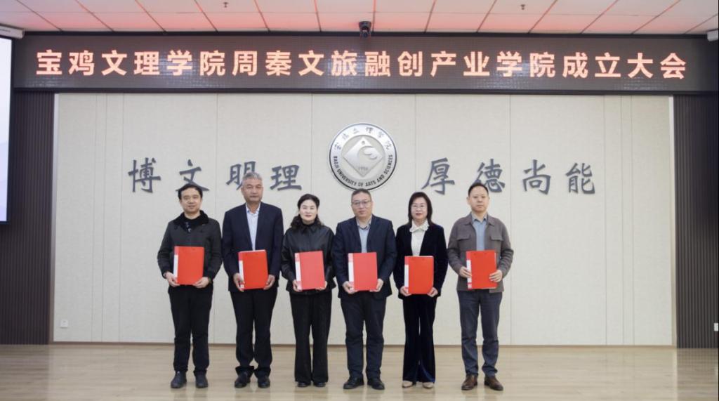 会议期间,冯飞龙为宝鸡文理学院周秦文旅融创产业学院授牌。经济管理学院院长刘辉发布了产业学院建设规划。产业学院与宝鸡周道文化传播有限公司、宝鸡青铜器博物院、宝鸡周原博物院、宝鸡旅游规划院、宝鸡容海酒店、西安中实合富实业有限责任公司等6家共建单位签署《产教融合战略共建协议》;聘请张海明、赵东、宁亚莹、傅博、任周方、姚西鸣等6名行业专家担任“特聘产业导师”并颁发证书,张海明代表专家顾问致辞。
