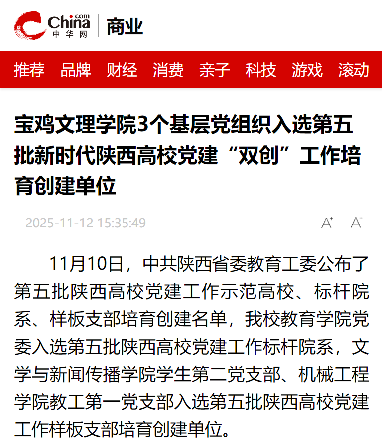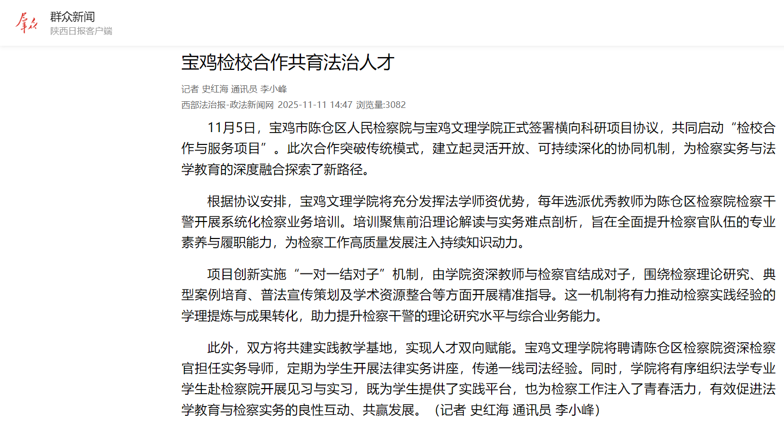 近日,学校开展“到延安去”·三秦学子圣地行教育活动、大学生社会实践基地在红光沟航天精神文化区揭牌、校友王佳佳为山区学生教授街舞受到广泛关注与赞誉、学校举办百企万岗进校园大型就业洽谈会、3个基层党组织入选第五批新时代陕西高校党建“双创”工作培育创建单位、与陈仓区人民检察院启动“检校合作与服务项目”、与宝鸡市生态环境局签署战略合作协议、纪念抗战胜利80周年舞台美术作品展在我校开幕、学校举行“AI视域下陕西当代文学研究高层论坛暨年度工作会议”等活动引起中央电视台、学习强国、西部法治报、西北在线、阳光网、陕西农村网、中华网、西铁宝鸡东站、今日头条等多家媒体广泛关注和报道。