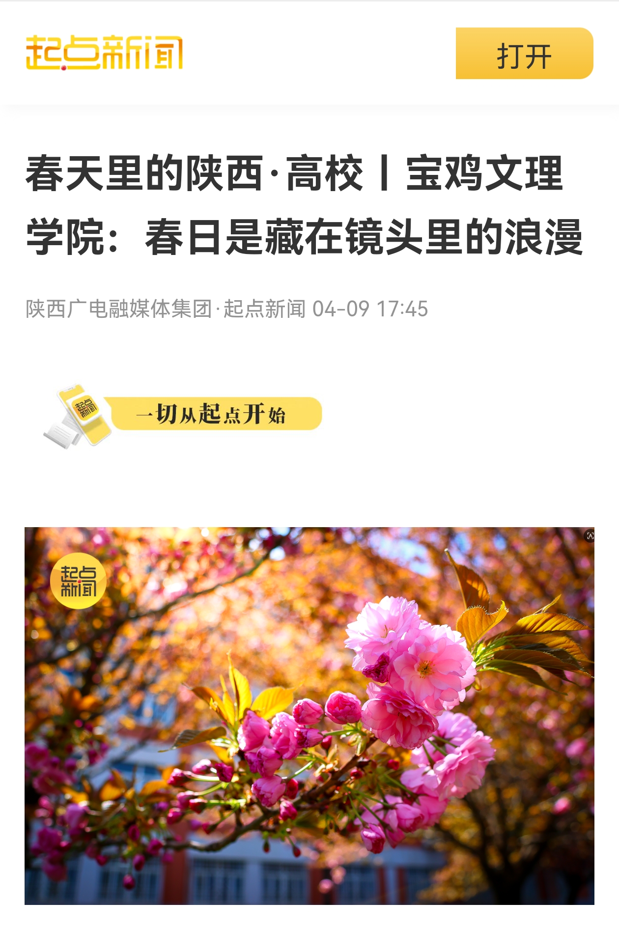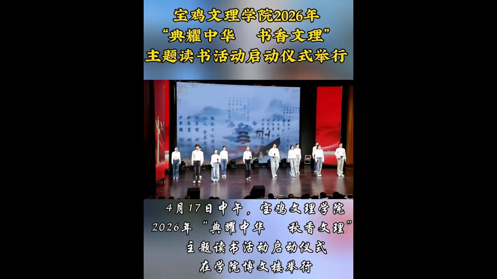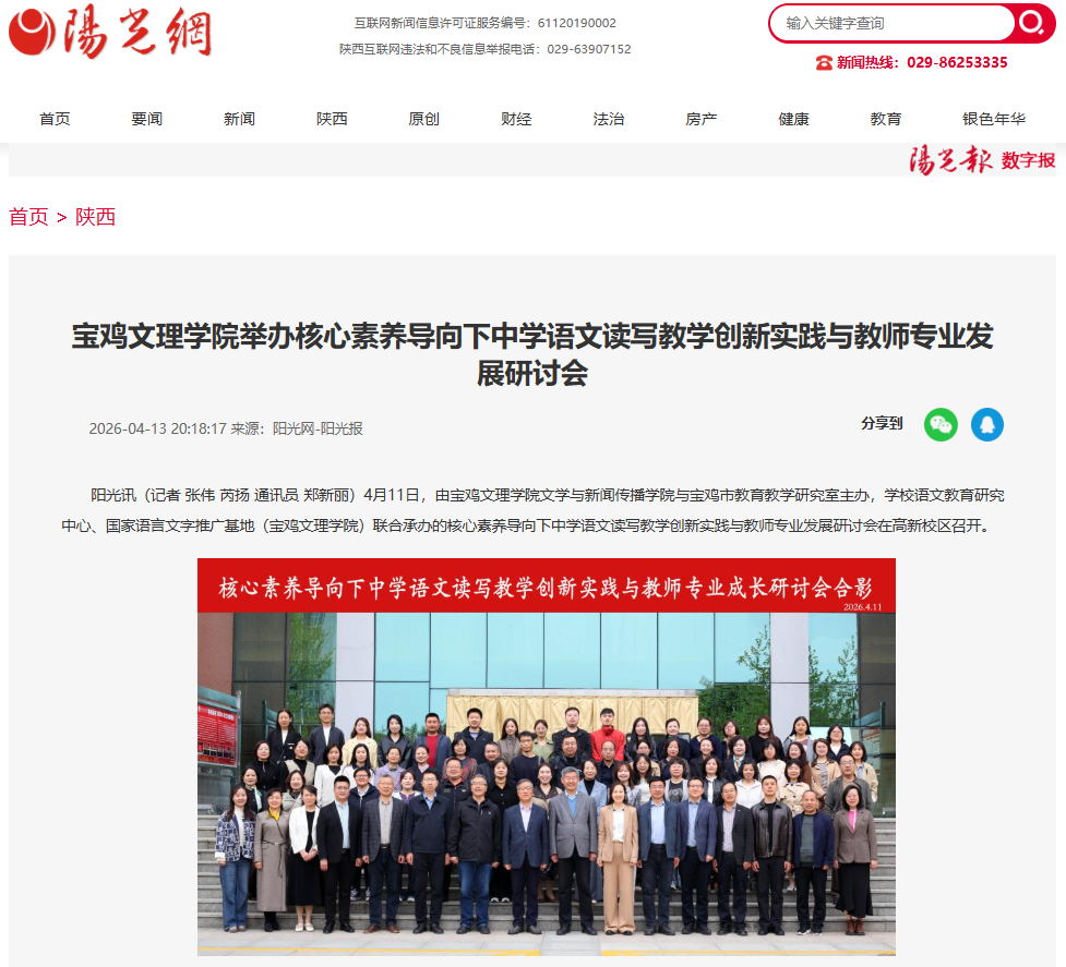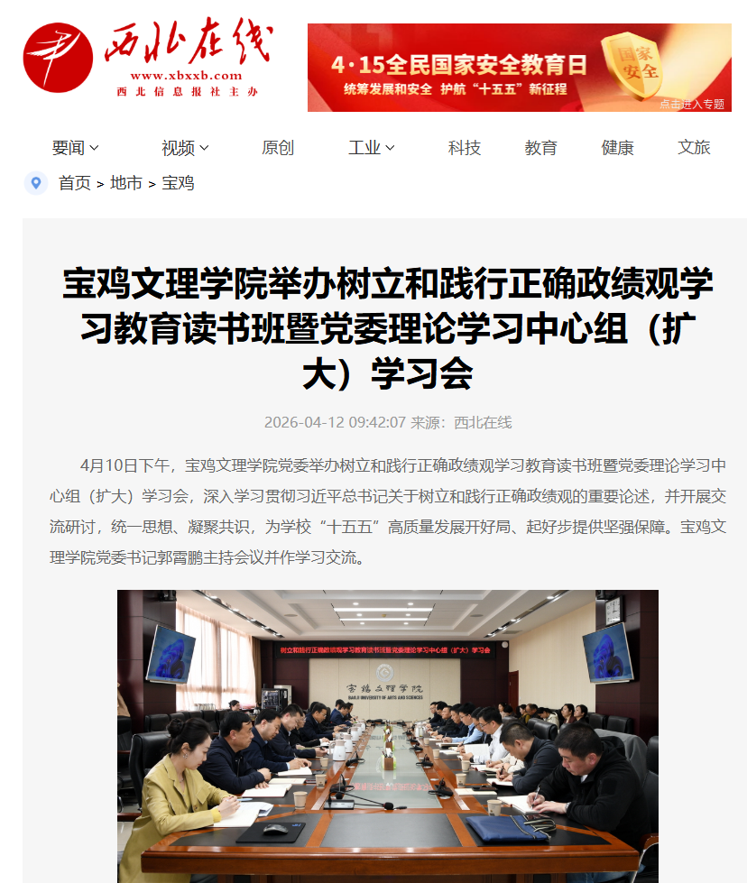近日,我校举办树立和践行正确政绩观学习教育读书班暨党委理论学习中心组(扩大)学习会、举办春季大型校园就业洽谈会、启动2026年“典耀中华书香文理”主题读书活动、举办核心素养导向下中学语文读写教学创新实践与教师专业发展研讨会、图书馆赵钊博士团队荣获省档案优秀科技成果三等奖、校园春日美景等引起西北在线、西北信息报、陕西农村网、阳光网、起点新闻、宝鸡二三里、宝鸡融媒体中心、中华网、今日头条、百度等多家媒体广泛关注和报道。