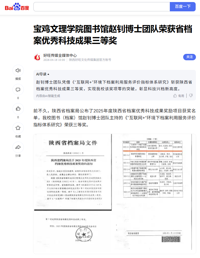 五、图书馆赵钊博士团队荣获省档案优秀科技成果三等奖