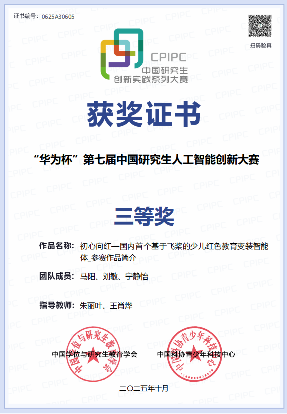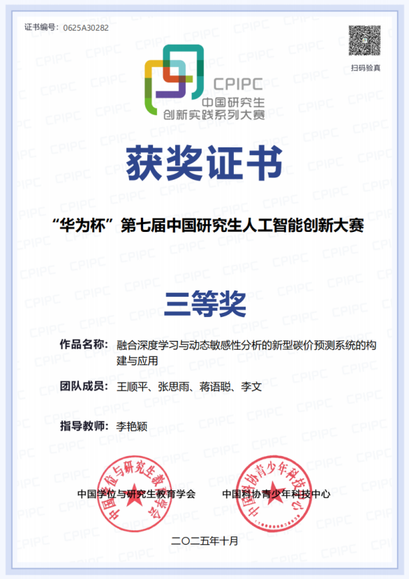 近日,“华为杯”第七届中国研究生人工智能创新大赛全国总决赛在山东青岛举行。我校参赛作品《融合深度学习与动态敏感性分析的新型碳价预测系统的构建与应用》《初心向红——国内首个基于飞桨的少儿红色教育变装智能体》获三等奖,实现了我校在中国研究生创新实践系列大赛中国家级奖项的历史性突破。