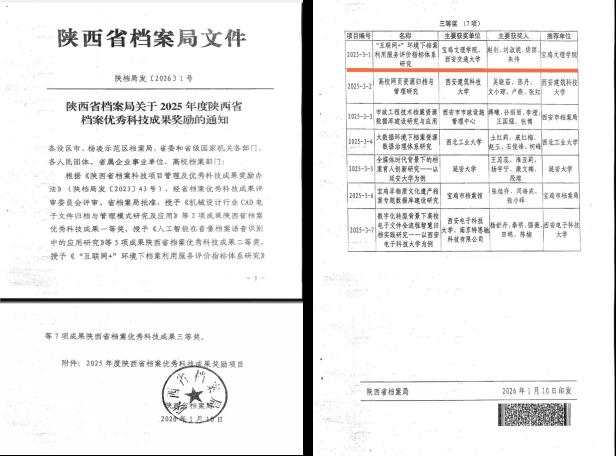 本次评奖是陕西省档案局根据《陕西省档案科技项目管理及优秀科技成果奖励办法》(陕档局发〔2023〕43号),在全省档案部门开展的每两年一次科技成果评奖活动,共评选出一等奖2项,二等奖5项,三等奖7项。西北工业大学、西安电子科技大学、西安建筑科技大学和我校等5所高校及其他省市级单位获奖。