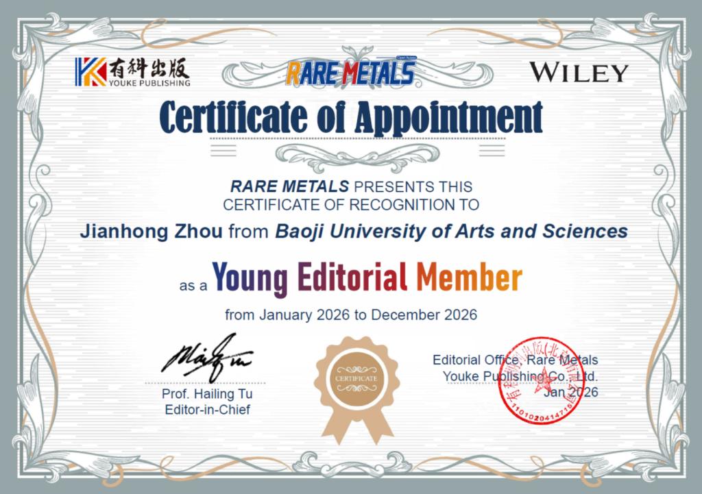 近日,我校物理与光电技术学院周建宏教授正式受聘为国际学术期刊《Rare Metals》青年编委。