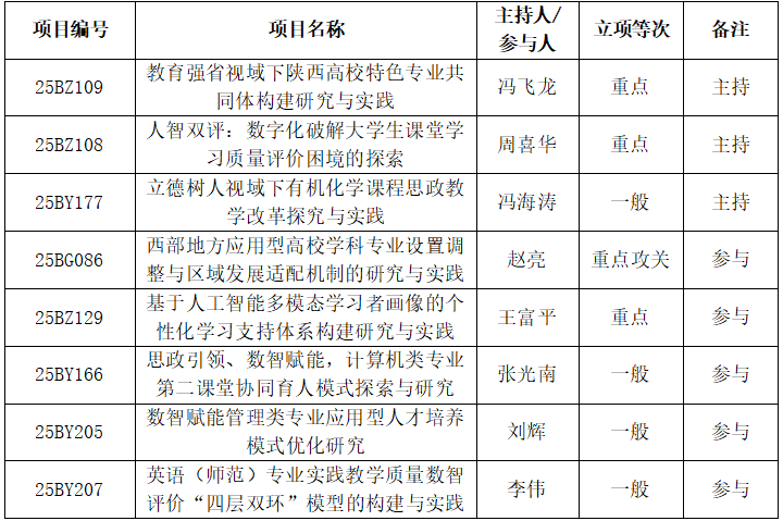 近日,陕西省教育厅公布了2025年度陕西本科和高等教育教学改革研究项目立项结果,我校主持或参与的8项本科教学改革研究项目获批立项。