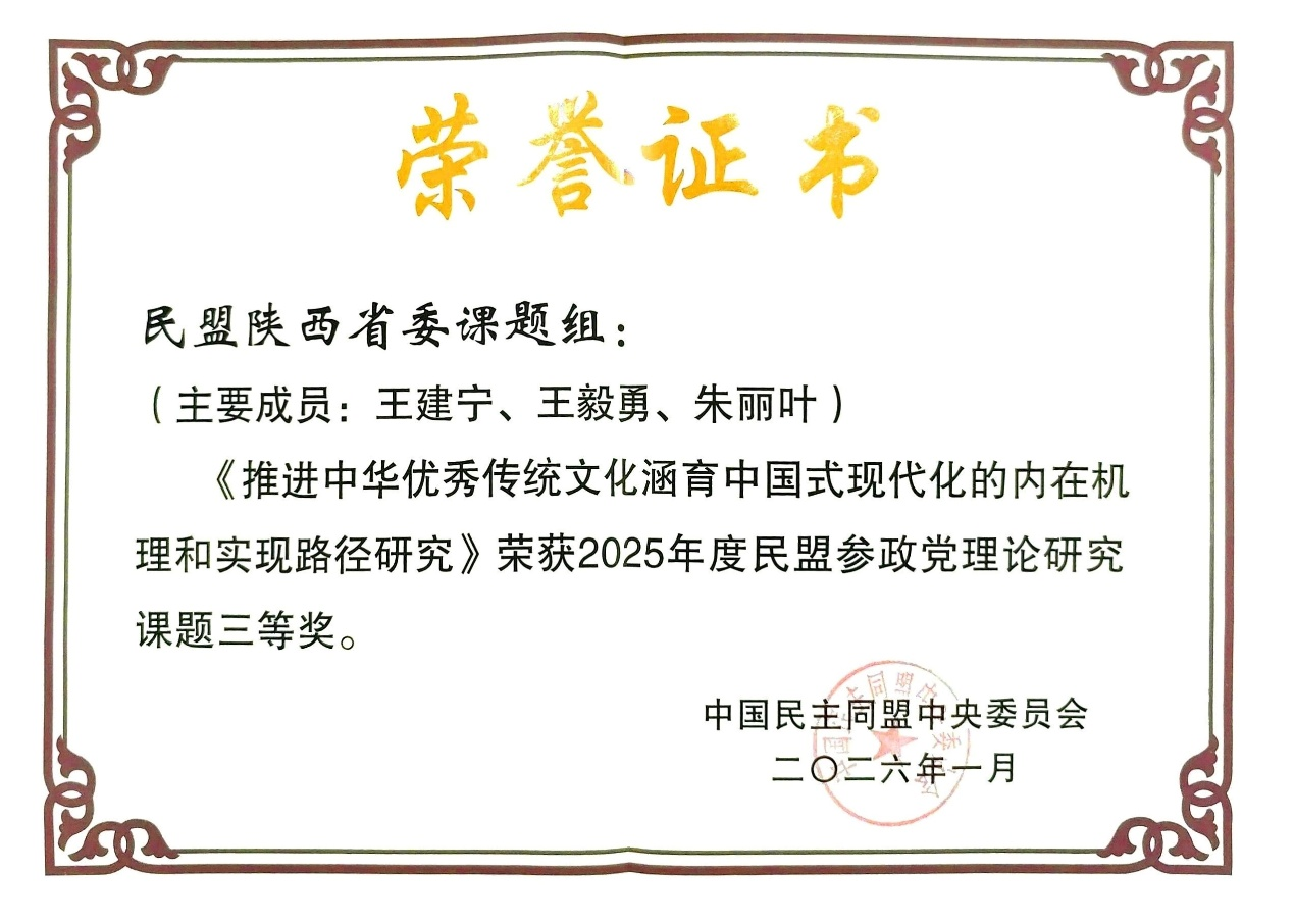 近期,民盟中央印发了《关于表彰2025年度民盟参政党理论研究获奖课题的决定》,我校民盟盟员王建宁、王毅勇、朱丽叶等撰写的《推进中华优秀传统文化涵育中国式现代化的内在机理和实现路径》获民盟中央2025年度参政党理论研究成果三等奖。